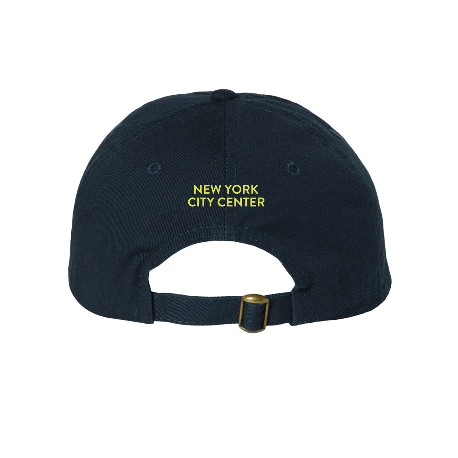 One size, 100% cotton bio-washed chino twill hat with an antique brass, tri-glide buckle closure and featuring "Hold Me Bat Boy" embroidered on the front and New York City Center's logo on the back.